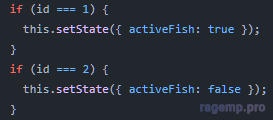 JavaScript:// Если хочется писать быдлокод, то пиши вот так if (id === 1) this.setState({ activeFist: true }) else if (id === 2) this.setState({ activeFist: false }) // Или вот так // Вообще непонятно, почему ты передаешь какие-то цифры, чтобы потом что-то включить/выключить // И табы реализуются совсем по-другому // А конкретно вот так // Есть список табов и текущий index таба this.state = { tabs: ["Рыбы", "Морепродукты"], tab: 0 } // Функция смены таба changeSection = (i) => { if (this.state.tabs[i] != null) this.setState({ tab: id }) }