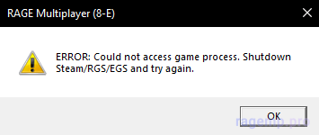 Как и сказано в ошибке: завершите все процессы Steam / Rockstar Game Service / Epic Games Store и попробуйте подключится еще раз. Также некоторым помогает запуск от имени администратора и отключение антивируса (или добавления каталога RAGE:MP в исключения антивируса, часто подобные проблемы возникают на антивирусе Kaspersky).