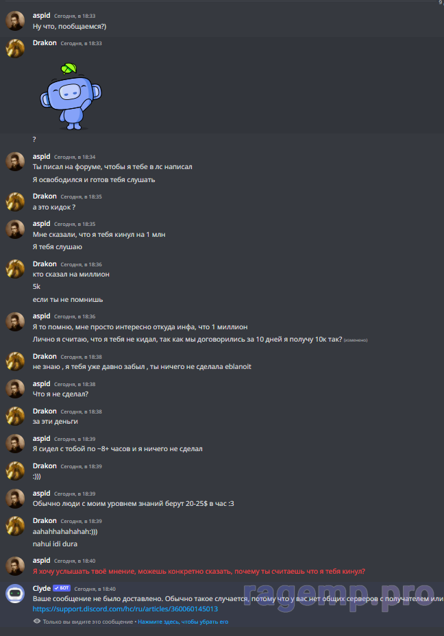Если ты хочешь нормально пообщаться, го в дискорд выясним все проблемы, я пойму твою точку зрения и расскажу свою