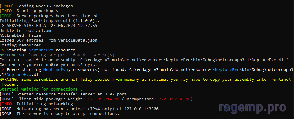 Код:[INFO] Loading NodeJS packages... [INFO] Starting packages... [DONE] Server packages have been started. Initializing Bootstrapper.dll (1.1.0.0).. -> SERVER STARTED AT 26.06.2023 17:37:15 Unable to load acl.xml ACLEnabled: False Loaded 667 entries from vehicleData.json Loading resources.. -> Starting NeptuneEvo resource.. NeptuneEvo: loading scripts.. found 1 script(s) NeptuneEvo: instantiating NeptuneEvo.Main.. Object cannot be cast from DBNull to other types. Object cannot be cast from DBNull to other types. 17:37:16.470 | Info | Main | No Connect To Main DataBase Object cannot be cast from DBNull to other types. Object cannot be cast from DBNull to other types. 17:37:16.487 | Info | Main | No Connect To Main Config 17:37:16.576 | Info | Utils.Redis | Start: All ok. For server: 0 17:37:16.579 | Info | Main | Backup Starting Object cannot be cast from DBNull to other types. Object cannot be cast from DBNull to other types. 17:37:16.603 | Succ | Core.Economy | Economy loaded. 17:37:16.611 | Info | Chars.Repository | [00:00:00.0008847] Inventory system loaded (0) 17:37:16.632 | Info | nTimer | Elapsed(5175e379-ca30-401c-a99f-99ec8a662bf6,MS:0,ONCE:True,From:) Task #1 Exception: System.InvalidCastException: Object cannot be cast from DBNull to other types. at System.DBNull.System.IConvertible.ToInt32(IFormatProvider provider) at MySql.Data.MySqlClient.Driver.LoadCharacterSets(MySqlConnection connection) at MySql.Data.MySqlClient.Driver.Configure(MySqlConnection connection) at MySql.Data.MySqlClient.MySqlConnection.Open() at NeptuneEvo.Functions.BackupSql.Backup() in C:\Users\qweiu\Downloads\redage_v3-main\dotnet\resources\NeptuneEvo\Functions\BackupSql.cs:line 30 at Redage.SDK.nTimer.<Elapsed>b__32_0() in C:\Users\qweiu\Downloads\redage_v3-main\dotnet\resources\NeptuneEvoSDK\Timers.cs:line 428 The given key '63' was not present in the dictionary. The given key '63' was not present in the dictionary. The given key '63' was not present in the dictionary. The given key '63' was not present in the dictionary. The given key '63' was not present in the dictionary. The given key '63' was not present in the dictionary. The given key '63' was not present in the dictionary. The given key '63' was not present in the dictionary. The given key '63' was not present in the dictionary. The given key '63' was not present in the dictionary. The given key '63' was not present in the dictionary. The given key '63' was not present in the dictionary. The given key '63' was not present in the dictionary. Unhandled exception. System.Collections.Generic.KeyNotFoundException: The given key '63' was not present in the dictionary. at System.Collections.Generic.Dictionary`2.get_Item(TKey key) at MySql.Data.MySqlClient.MySqlField.SetFieldEncoding() at MySql.Data.MySqlClient.MySqlField.set_CharacterSetIndex(Int32 value) at MySql.Data.MySqlClient.NativeDriver.GetColumnData(MySqlField field) at MySql.Data.MySqlClient.NativeDriver.GetColumnsData(MySqlField[] columns) at MySql.Data.MySqlClient.Driver.GetColumns(Int32 count) at MySql.Data.MySqlClient.ResultSet.LoadColumns(Int32 numCols) at MySql.Data.MySqlClient.ResultSet..ctor(Driver d, Int32 statementId, Int32 numCols) at MySql.Data.MySqlClient.Driver.NextResult(Int32 statementId, Boolean force) at MySql.Data.MySqlClient.MySqlDataReader.NextResult() at MySql.Data.MySqlClient.MySqlDataReader.Close() at MySql.Data.MySqlClient.MySqlCommand.ResetReader() at MySql.Data.MySqlClient.MySqlCommand.ExecuteReader(CommandBehavior behavior) at MySql.Data.MySqlClient.MySqlCommand.ExecuteDbDataReader(CommandBehavior behavior) at System.Data.Common.DbCommand.ExecuteDbDataReaderAsync(CommandBehavior behavior, CancellationToken cancellationToken) --- End of stack trace from previous location where exception was thrown --- at LinqToDB.Data.DataConnection.ExecuteReaderAsync(CommandBehavior commandBehavior, CancellationToken cancellationToken) at LinqToDB.Data.DataConnection.QueryRunner.ExecuteReaderAsync(CancellationToken cancellationToken) at LinqToDB.Linq.QueryRunner.ExecuteQueryAsync[T](Query query, IDataContext dataContext, Mapper`1 mapper, Expression expression, Object[] ps, Object[] preambles, Int32 queryNumber, Func`2 func, TakeSkipDelegate skipAction, TakeSkipDelegate takeAction, CancellationToken cancellationToken) at LinqToDB.Linq.QueryRunner.ExecuteQueryAsync[T](Query query, IDataContext dataContext, Mapper`1 mapper, Expression expression, Object[] ps, Object[] preambles, Int32 queryNumber, Func`2 func, TakeSkipDelegate skipAction, TakeSkipDelegate takeAction, CancellationToken cancellationToken) at LinqToDB.Linq.ExpressionQuery`1.GetForEachAsync(Action`1 action, CancellationToken cancellationToken) at LinqToDB.AsyncExtensions.ToListAsync[TSource](IQueryable`1 source, CancellationToken token) at NeptuneEvo.Chars.Repository.InitRoulette() in C:\Users\qweiu\Downloads\redage_v3-main\dotnet\resources\NeptuneEvo\Chars\Repository.cs:line 1083 at NeptuneEvo.Chars.Repository.InitRoulette() in C:\Users\qweiu\Downloads\redage_v3-main\dotnet\resources\NeptuneEvo\Chars\Repository.cs:line 1147 at System.Threading.Tasks.Task.<>c.<ThrowAsync>b__139_1(Object state) at System.Threading.QueueUserWorkItemCallback.<>c.<.cctor>b__6_0(QueueUserWorkItemCallback quwi) at System.Threading.ExecutionContext.RunForThreadPoolUnsafe[TState](ExecutionContext executionContext, Action`1 callback, TState& state) at System.Threading.QueueUserWorkItemCallback.Execute() at System.Threading.ThreadPoolWorkQueue.Dispatch() at System.Threading._ThreadPoolWaitCallback.PerformWaitCallback()Out of sync with server