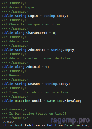 Код:/// <summary> /// Account login /// </summary> public string Login = string. Empty; /// <summary> /// Character unique identifier /// </summary> public ulong Characterld = 0; /// <summary> /// Admin name /// </summary> public string AdminName = string. Empty; /// <summary> /// Admin character unique identifier /// </summary> public ulong Adminid = 0; /// <summary> /// Reason /// </summary> public string Reason = string. Empty;