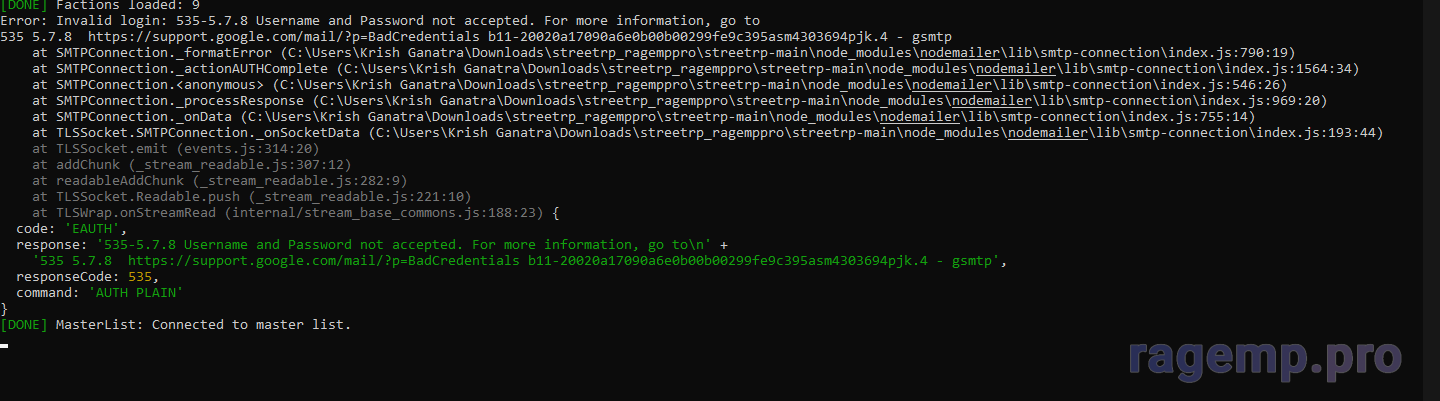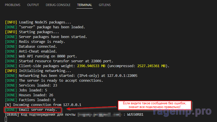 Вуаля, запускаем сервер и в консоли видим сообщение если почтовый сервер успешно подключен: