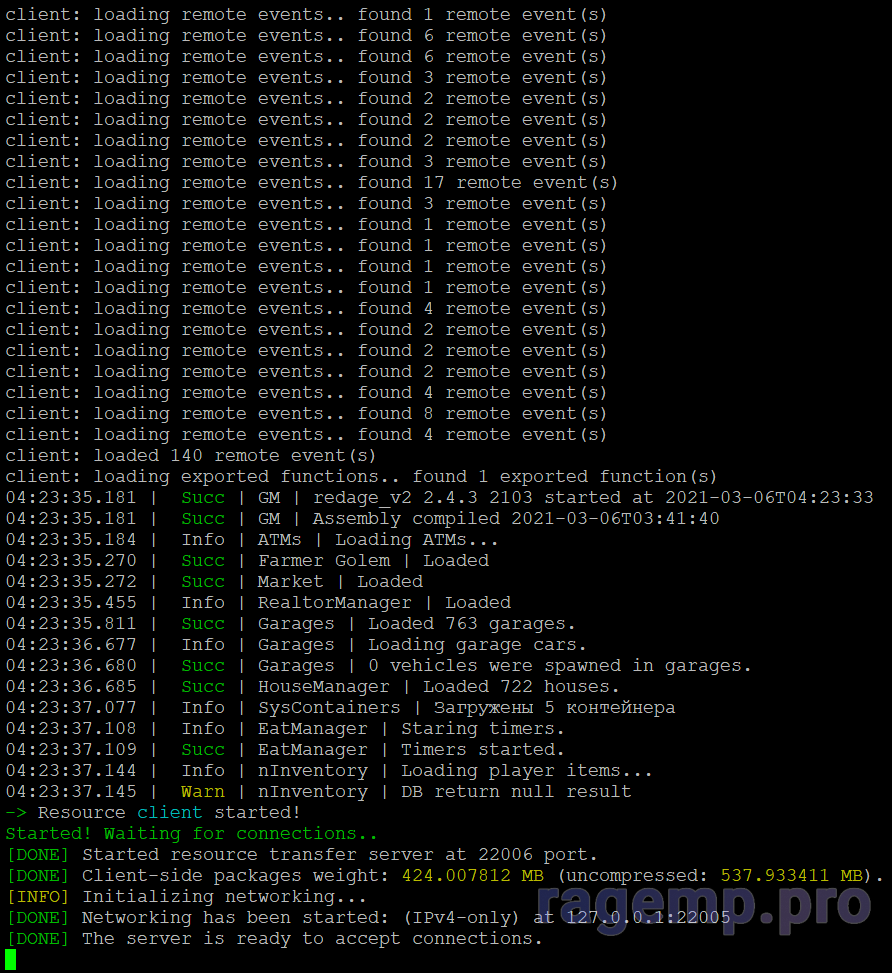 Запустим чистый сервер (командой - ./ragemp-server) и убедимся что все работает корректно, мы должны получить чистый лог запуска сервера, без ошибок.