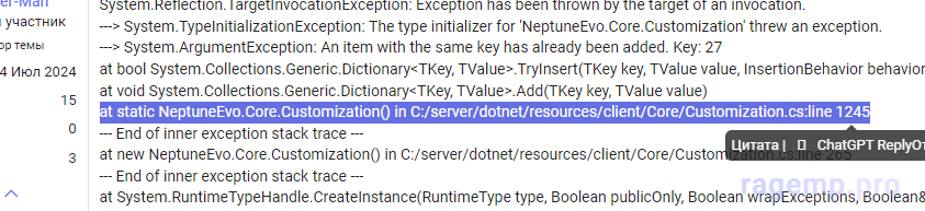 В классе NeptuneEvo.Core.Customization ты пытаешься добавить в словарик Dictionary<TKey, TValue> на 1245 строке элемент с ключом 27, который уже там существует.