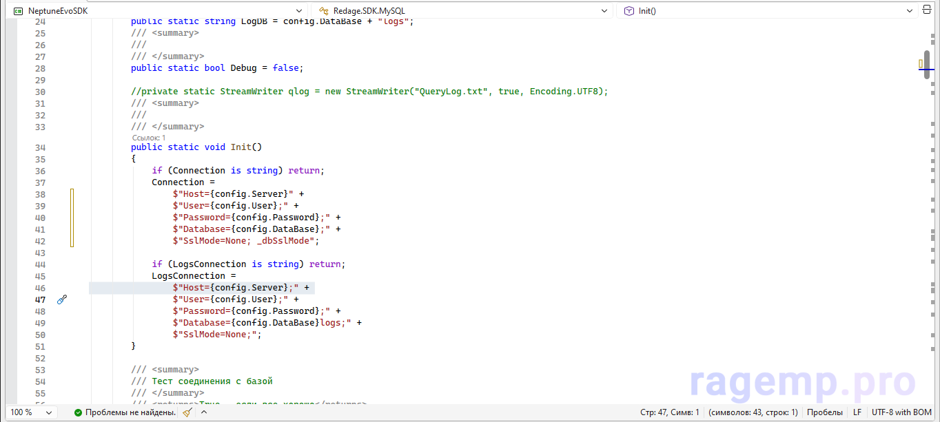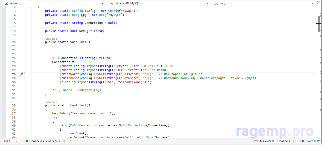 не надо пожалуйста на форуме вставлять ответы от нейросети, когда ты сам даже не понимаешь, что пишешьделай так: создаешь в папке сервера файл db.js и вставляешь туда const mysql = require('mysql2'); const pool = mysql.createPool({ host: '127.0.0.1', port: 3306, user: 'root', password: 'твойпароль', database: 'ragemp' }); module.exports = pool;. Потом в любом скрипте сервера подключаешь базу через const db = require('./db');. И еще проверь в MySQL, чтобы база была и пользователь с правами: CREATE DATABASE ragemp; CREATE USER 'root'@'localhost' IDENTIFIED BY 'твойпароль'; GRANT ALL PRIVILEGES ON ragemp.* TO 'root'@'localhost'; FLUSH PRIVILEGES;. Больше в JSON ничего менять не нужно, RageMP через этот JS подключается и все работает.
