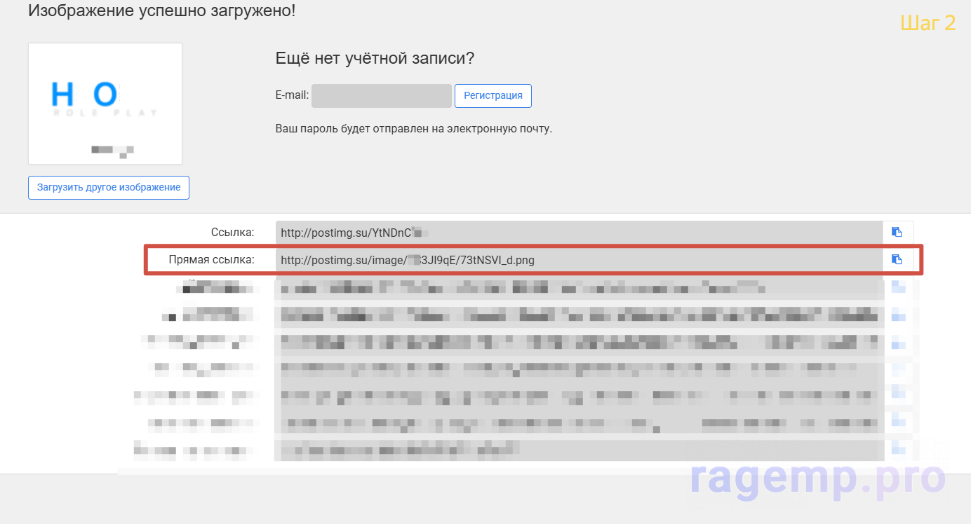 https://postimg.su и загружаете туда своё лого, дожидаетесь полной загрузки вашего лого, копируете ссылку как на фото с припиской "шаг 2".