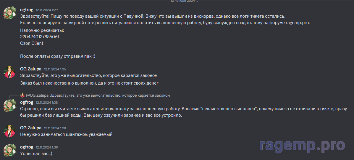С вами мирно решили благодаря Харладну, не знаю кто там общался со мной из вашей команды, но резко давать в отказ, когда билд уже готов - такое себе. Это я еще молчу про то, что ваш человек себе никнеймы поменял в моменте и начал писать "да вы вымогаете у нас деньги" - вот это действительно детский сад.
