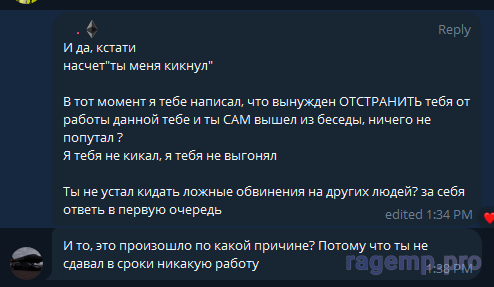 Отстранить от работы оно и значит, что отстранить от работы. До будущего моего решения. За телефон я тебе сказал - зальешь готовый телефон работающий => я обязательно тебе его оплачу. На данный момент нету ничего корректно работающего. Ты опять таки САМ вышел из группы и устроил драму в моменте. Все пацаны @xDeveluxe @Mikhayloff @Inoi не дадут спиздеть за это.Полтора месяца? Ахахахах, бля знаешь что я вспомнил.