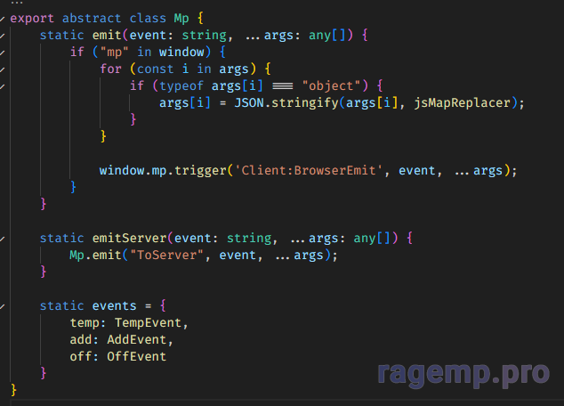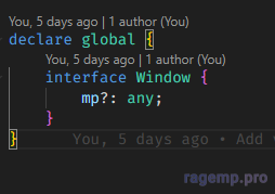 И если используешь TypeScript нужно дать ему знать, что у тебя в window будет находится объект mp. Можешь задать any тип, или можешь прописать весь тип чтобы сделать автозаполнение. Это нужно поставить куда-то в основной файл с типами или в любой основной файл, у меня пока что в main.ts лежит.