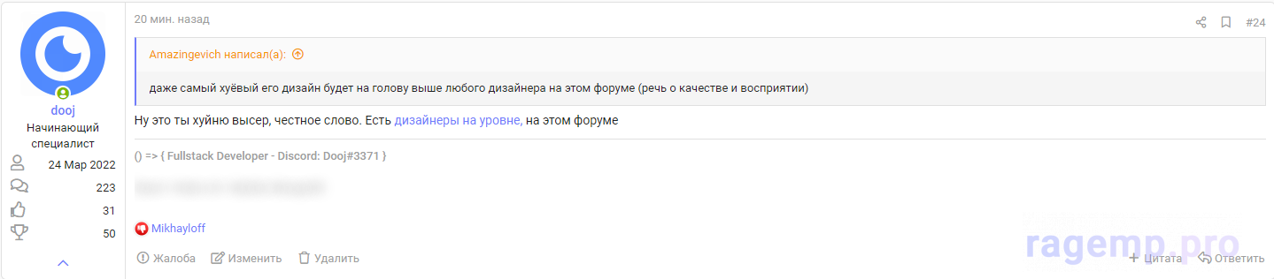 чел, я никогда не гнался и не гонюсь за званием лучшего. Мне абсолютно до пизды на это. Я делаю так как мне нравится и так как я вижу. Ко мне обращается очень много людей, которые в 98% случаев остаются довольны. Если нет - мы решаем этот вопрос, но если кто -то уходит недовольным и начинает где-то говорить, что я делаю хуйню, то это проблема этого человека, а не меня. Потому что я всегда работаю со всеми пожеланиями заказчиков.Твои дизайны я видел, полный разброс, не одного компонента (на фулл проект) и не одной анимации.