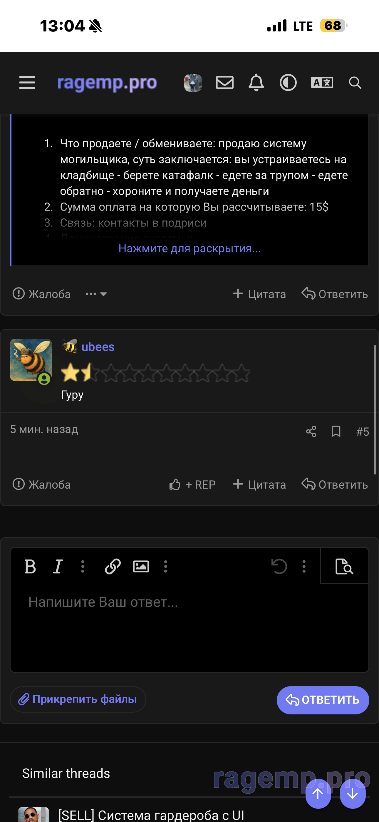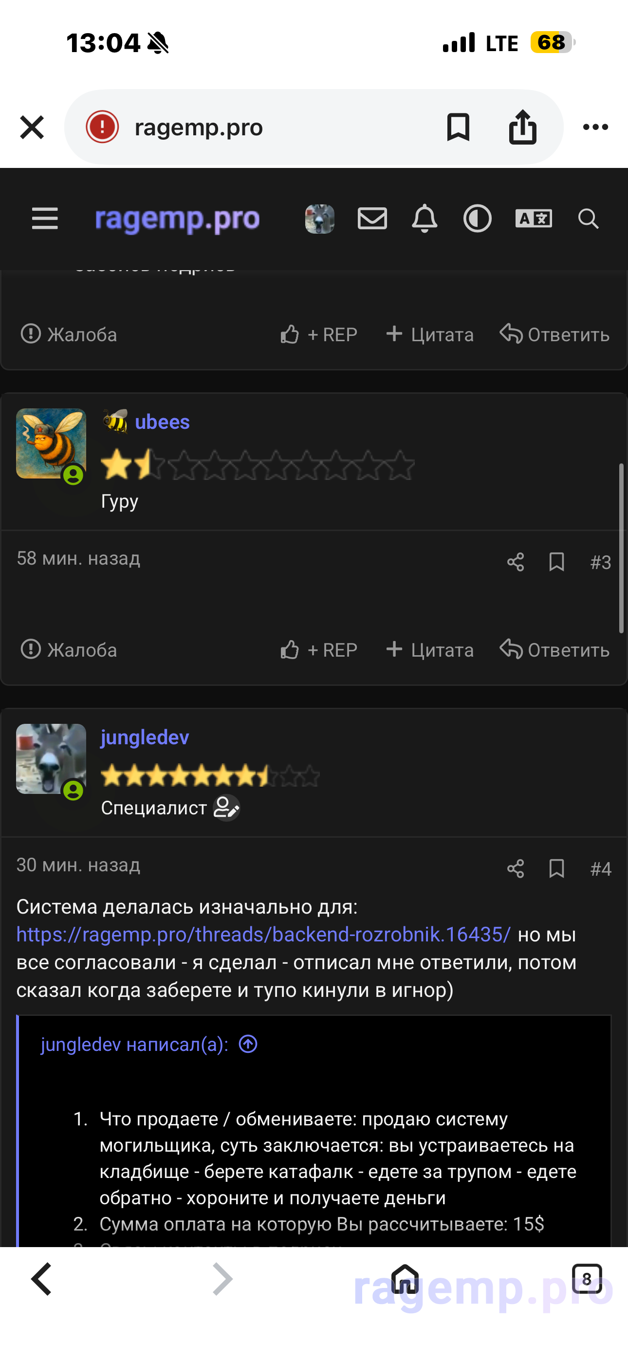 1. Что продаете / обмениваете: продаю систему могильщика, суть заключается: вы устраиваетесь на кладбище - берете катафалк - едете за трупом - едете обратно - хороните и получаете деньги