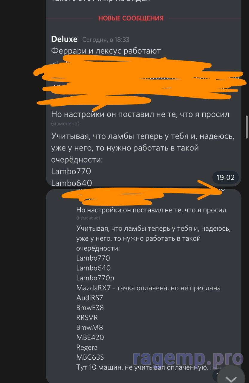 - Перечисление машин (20 штук): bmwi8, bmwm5, bugatti, ferrari488, lambo770, lambo770p, lambo640, lx570, mbc63, mbg63, supra, camry, mazdarx7, rrsvr, bmwm8, bmwe38, audirs7, bme420, regera, mbc63s. И это то, что я нашел самым первым в диалоге с исполнителем, потенциально, там было сделано даже больше, ниже пример вырезка из диалога команды: