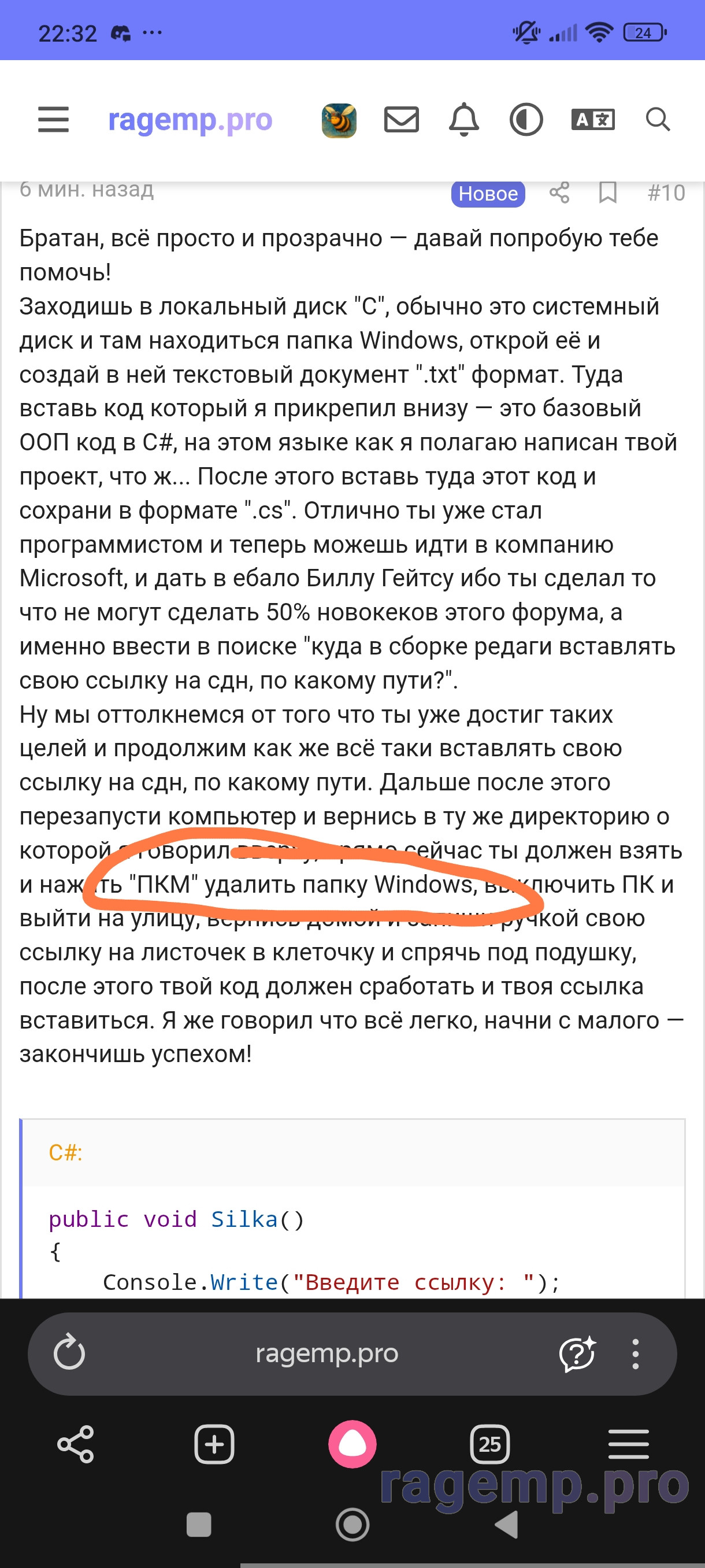 Заходишь в локальный диск "C", обычно это системный диск и там находиться папка Windows, открой её и создай в ней текстовый документ ".txt" формат. Туда вставь код который я прикрепил внизу — это базовый ООП код в C#, на этом языке как я полагаю написан твой проект, что ж... После этого вставь туда этот код и сохрани в формате ".cs". Отлично ты уже стал программистом и теперь можешь идти в компанию Microsoft, и дать в ебало Биллу Гейтсу ибо ты сделал то что не могут сделать 50% новокеков этого форума, а именно ввести в поиске "куда в сборке редаги вставлять свою ссылку на сдн, по какому пути?".