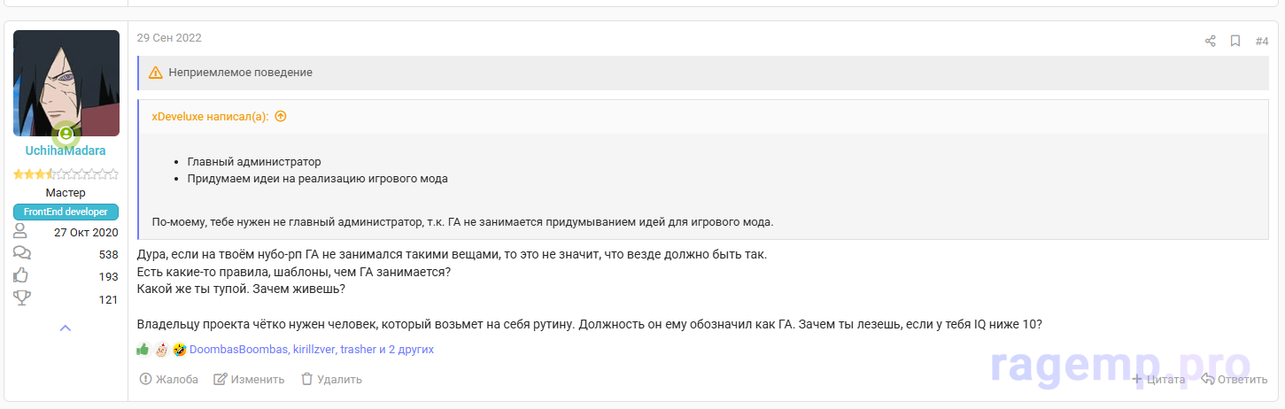 Заканчивая пассаж про роли - первые в моём списке обратно на хай кодера, кому не нужно проходить отдельные верификации - это собственно @UchihaMadara если ты вдруг решишь на форуме че то делать кроме обкладывания Паши хуями постоянного. И мб ReinerGhost но ему очевидно на это похуй, в тусовке на форуме он вроде никогда не был заинтересован.