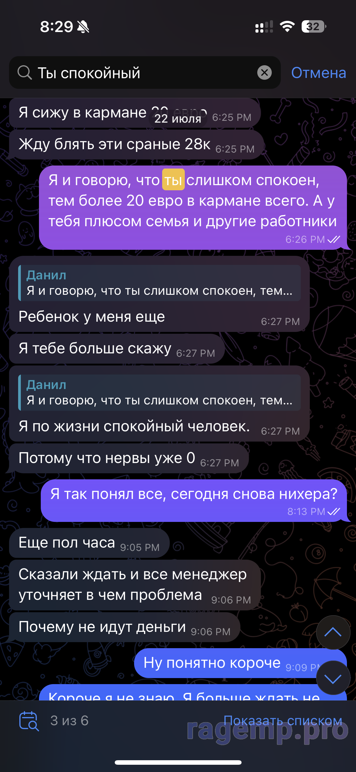 Касательно эмоджи «ок» на его высер про август: после этого я конечно сильно охренел и сразу решил, что с этим человеком я точно не сработаюсь. Ну вы сами видите какой это сложный человек, который не слышит других совершенно, а стоит только на своем. Кто будет из всех тут присутствующих разработчиков бесплатно работать, если не успел в нечеловеческие сроки? Я уверен, что никто. Вот и я так же не собирался, тем более не раз ему прежде было сказано, что август - нереальный срок, но ему похер, он настаивал именно на этом сроке и меня вообще не слышал. Подыскивал нормальную работу, чтобы уже в августе, как только он меня попрекнет этим сообщением, я скажу ему «пока».