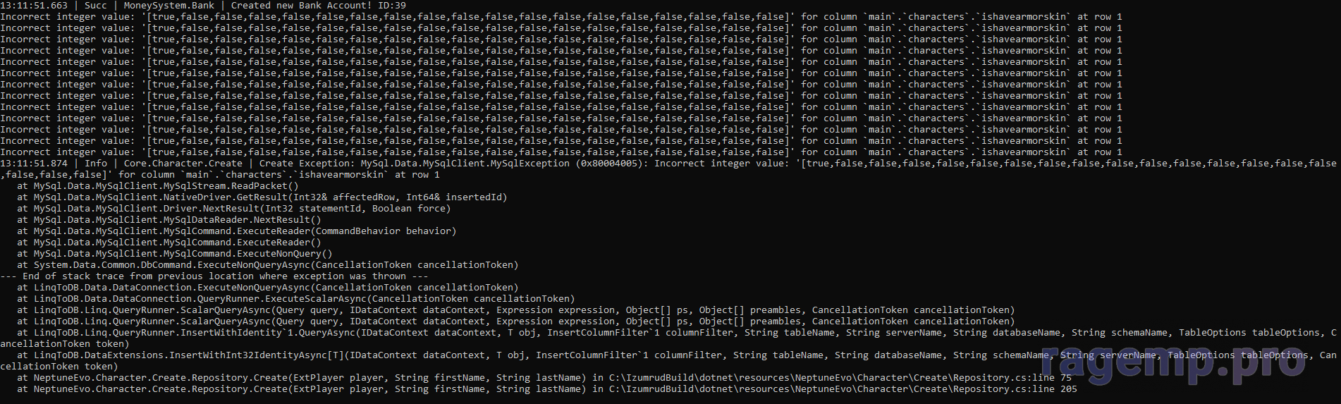 Если ты не закинул таблицу с логами и прочим, при сохранении аккаунта сервер пытается обратиться опять же в несуществующую таблицу