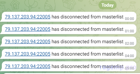 Если ваш сервер присутствует в мастерлисте, скрипт молча пушнет в лог о том, что сервер жив, в тг сообщение не улетит.